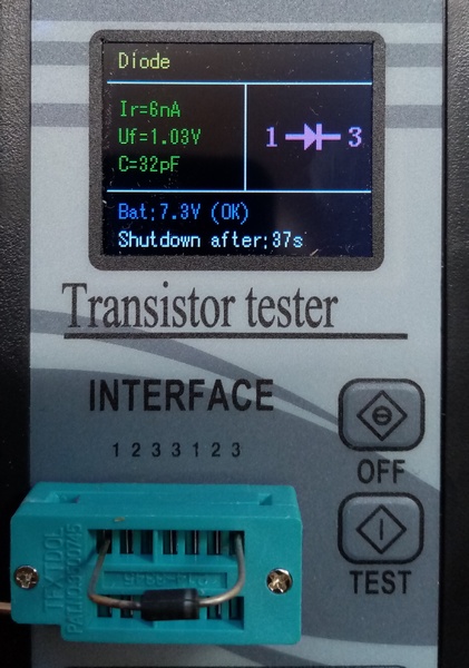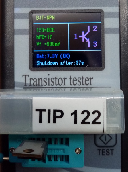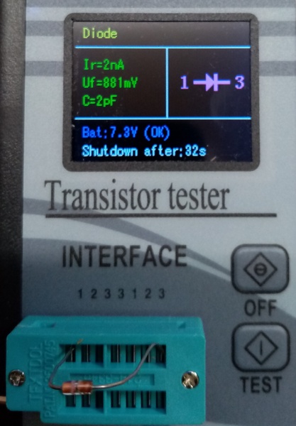 Es ist erstaunlich, was der Bauteile-Tester leisten kann: er findet die Anschlüsse (siehe Diode) und beim Transistor sogar den Typ (BJT-NPN), die Anschluss-Belegung (BCE), Verstärkungsfaktor (hFE) und Vf (?).
