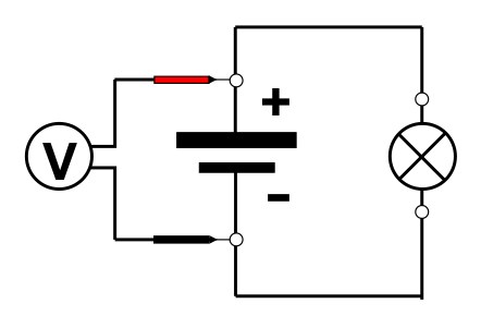 Das Spannungs-Meßgerät (Voltmeter) wird parallel zur Spannungsquelle oder parallel zum Verbraucher geschaltet. Es ist auf die Polarität der Anschlüsse zu achten: