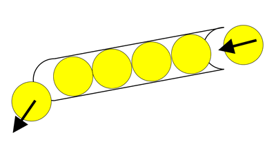 Stellen wir uns den Draht mit seinen Elektronen als ein Rohr gefüllt mit Kugeln vor, so genügt eine kleine Kugel einzudrücken, daß am anderen Ende gleichzeitig eine Kugel herausfällt.