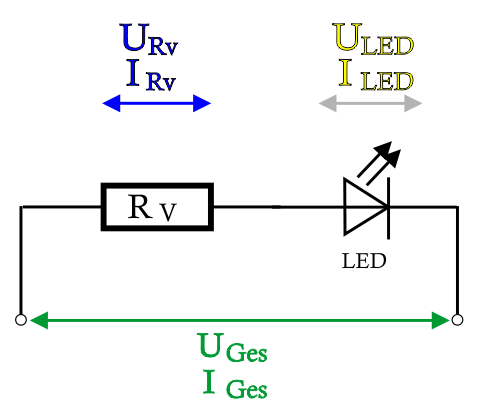 Es muss über den Widerstand der Rest der Betriebsspannung (U Ges) gedrosselt werden. Die Spannung an Rv ist das Ergebnis von U Ges abzüglich der LED-Spannung (U LED)
