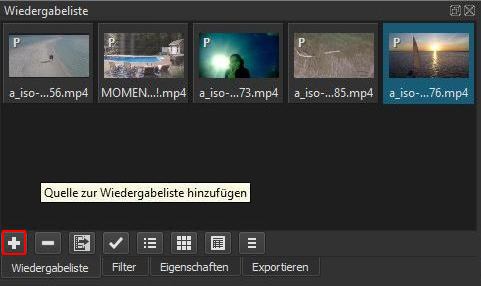 Nach dem Laden von Filmstücken in die Wiedergabeliste werden diese Filme als kleine Vorschaubilder dargestellt. Ein Doppelklick darauf markiert und startet den Film sofort im Abspielfenster. Einstellbar in der Wiedergabeliste / ≡ (Hamburger-Menu unten) / √ Nach dem Öffnen wiedergeben.
