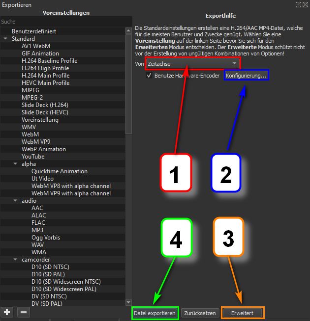 Unter "Format" erscheint eine seeeeehr laaange Liste zur Auswahl des Dateiformates. MP4 habe ich gewählt.