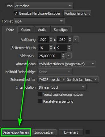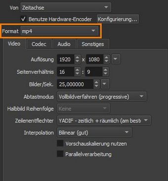 Standardmäßig ist bei Shotcut das Format "H.264/AMF" für MP4-Datei voreingestellt.