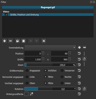 Unter  Position  ist die linke obere Ecke der Ansicht des Abspielfensters gemeint. Die linke Zahl bei Position, hier 0, bedeutet Null Abstand zur linken Rahmenseite. Die rechte Zahl von Position, hier 60, bedeutet ein Abstand von 60 Pixel vom oberen Rand zum Vogelrahmen.