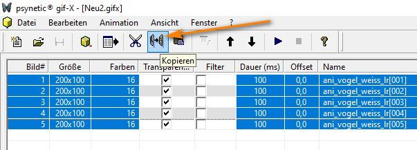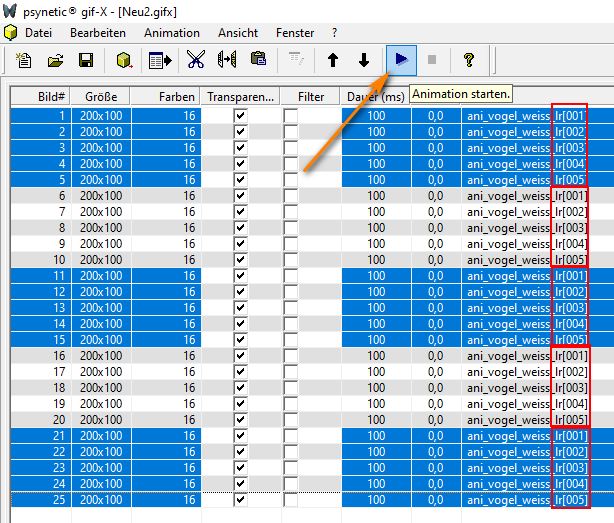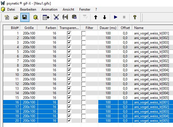 Zur besseren Übersicht habe ich die einzelnen Abschnitte farblich unterlegt. Es sind also mittlerweile aus 5 Bildern nun 25 geworden. Die Animation läft demnach 5 mal solang wie am Anfang!