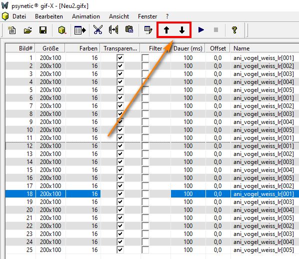 Sollte einmal etwas nicht ganz korrekt laufen, können die einzelnen Bilder markiert und mittels den Pfeilen im roten Kasten nach oben und unten verschoben werden.