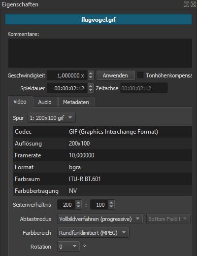 Unter Eigenschaften in Shotcut kan die Läge festgestellt werden: aus nur 12 Bildern wurde jetzt 2 Sekunden und 12 Bilder! Mit dieser Zeitspanne kann nun der Vogel über die Straße fliegen