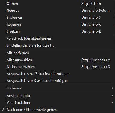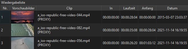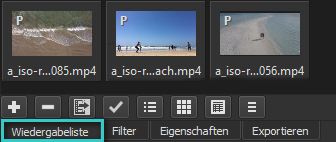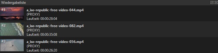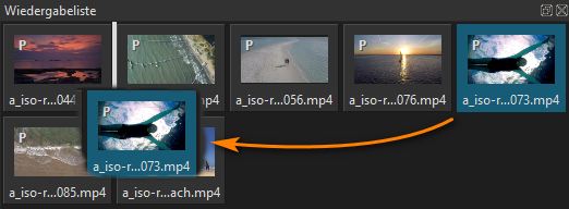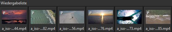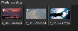 Nach dem Laden von Filmstücken in die Wiedergabeliste werden diese Filme als kleine Vorschaubilder dargestellt. In diesem Fenster kann die Reihenfolge der Darstellung geändert und auch Filme aus der Liste gelöscht werden. Ferner kann man diese kopieren und ersetzen.