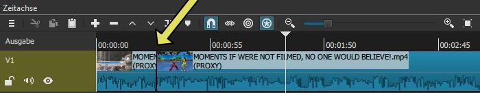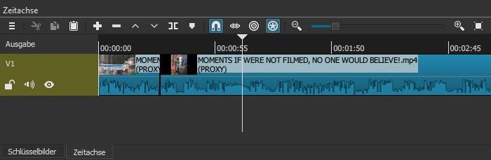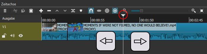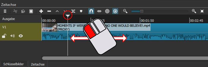 Durch Ziehen des Zeitcursors der Zeitachse mit der Maus kann ebenso einfachst die zu schneidende Position grob angefahren werden.
