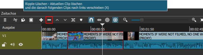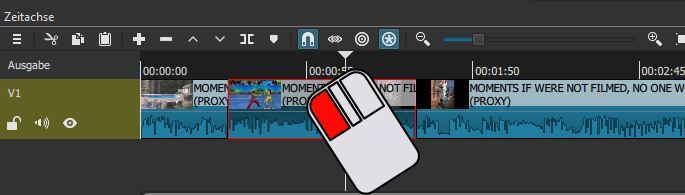 Im Gegensatz zum Schnitt im Abspielfenster wird alles in der Zeitachse selbst gesteuert: Maus und Pfeiltasten, Shotcut-Symbol und das - -Symbol, sowie die Tasten S und X . Eventuell sogar noch die Tasten Strg und Z für Rückgängig.