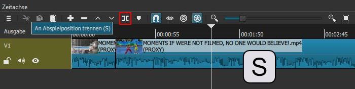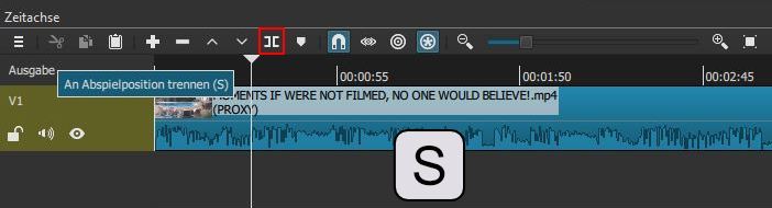 Der nächste Schnitt wird wieder entweder mit der Taste S oder mit dem rot markierten Shotcut-Symbol gesetzt.