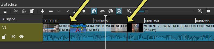 Das dritte Vorschaubild ist entstanden. Beide Schnittstellen (siehe gelbe Pfeile) gehen ganz durch, samt der Audiospur.